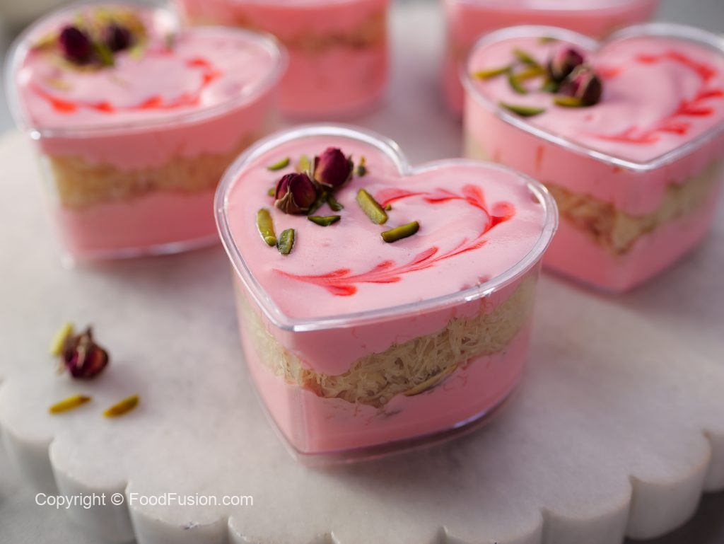 -In a serving cup,add prepared rose cream,pistachios,almonds,syrup coated pheni & spread evenly then add prepared rose cream & garnish with rose syrup,pistachios & dried rose buds (makes 8-9).