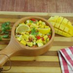 In bowl add mango cubes, cucumber cubes and tomato cubes, corn boiled and coriander leaves.