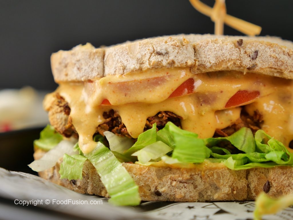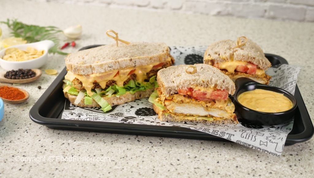 -On a multigrain bread slice,add & spread prepared special sauce,add iceberg,crispy chicken fillet,tomato slices,prepared sauce & cover with another slice to make a sandwich.