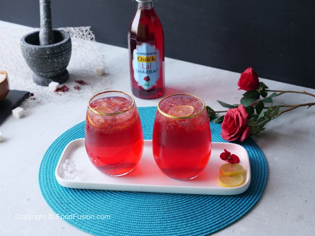 -In a serving glass,add ice cubes,basil seeds,water,lal sharbat and stir.