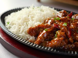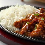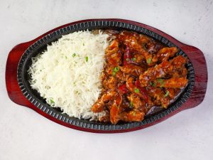 -Grease hot sizzling plate with butter,add rice,hot garlic chicken & serve with mash potatoes & sauteed vegetables!
