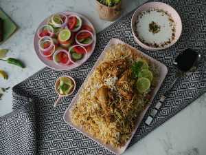 Add mint leaves,boiled rice,remaining prepared spice mix,fried onion,remaining boiled rice and ghee,cover & cook on high flame to build up the steam (4-5 minutes) then turn flame to low and steam cook for 25-30 minutes.