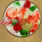Glass mein lal sharbat,corn flour ki seviyan,tukh malanga,green jelley,red jelly,mix dry fruits,rabri (thickened milk),vanilla ice cream,red jelly,green jelly,mix dry fruits aur lal sharbat dal dein.