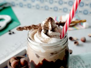 Serving glass mein chocolate syrup,ice cubes aur tayyar nutella iced coffee dal dein,whipped cream aur cocoa powder sprinkle ker ka serve karein.