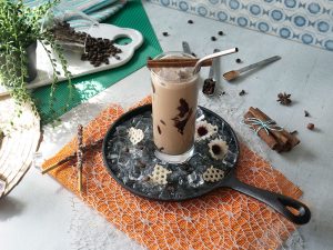 In a serving glass,add ice cubes,chocolate syrup,prepared mexican iced coffee & serve!