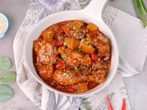 In a bowl,add gochujang paste,soy sauce,hot sauce,oyster sauce,garlic,sugar,red chilli crushed, chicken powder,water,whisk well & set aside.