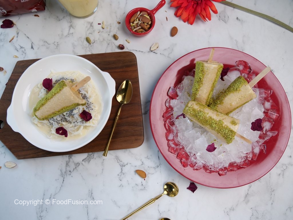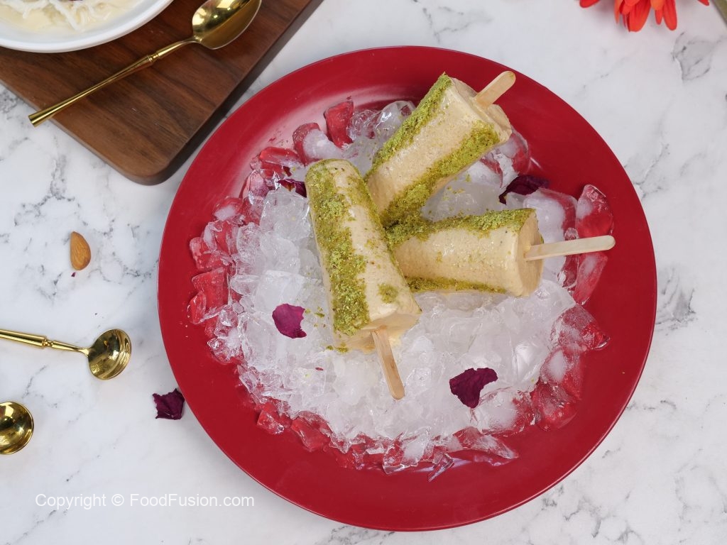 -Pour kulfi mixture in kulfi molds,cover with aluminium foil,insert ice cream stick & freeze for 10 hours or overnight in freezer.