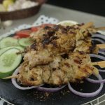 Marinated chicken ko wooden skewers per laga lein (makes 9-10).