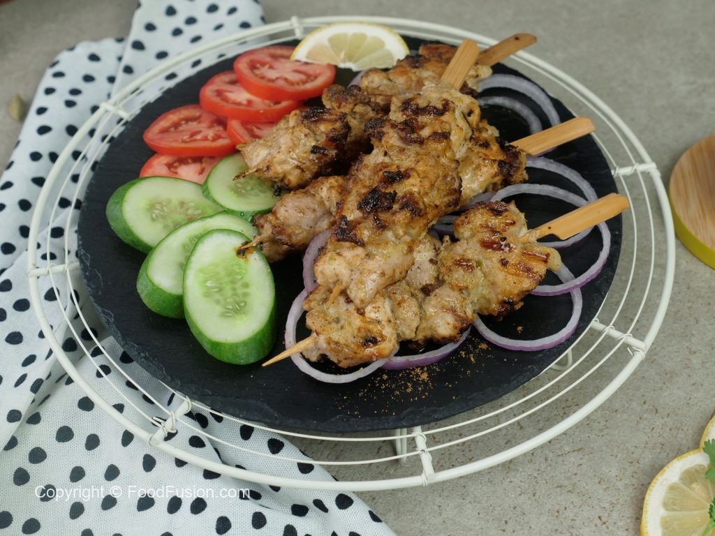 Grease cast iron grill pan with cooking oil & fry skewers from all sides until golden brown.