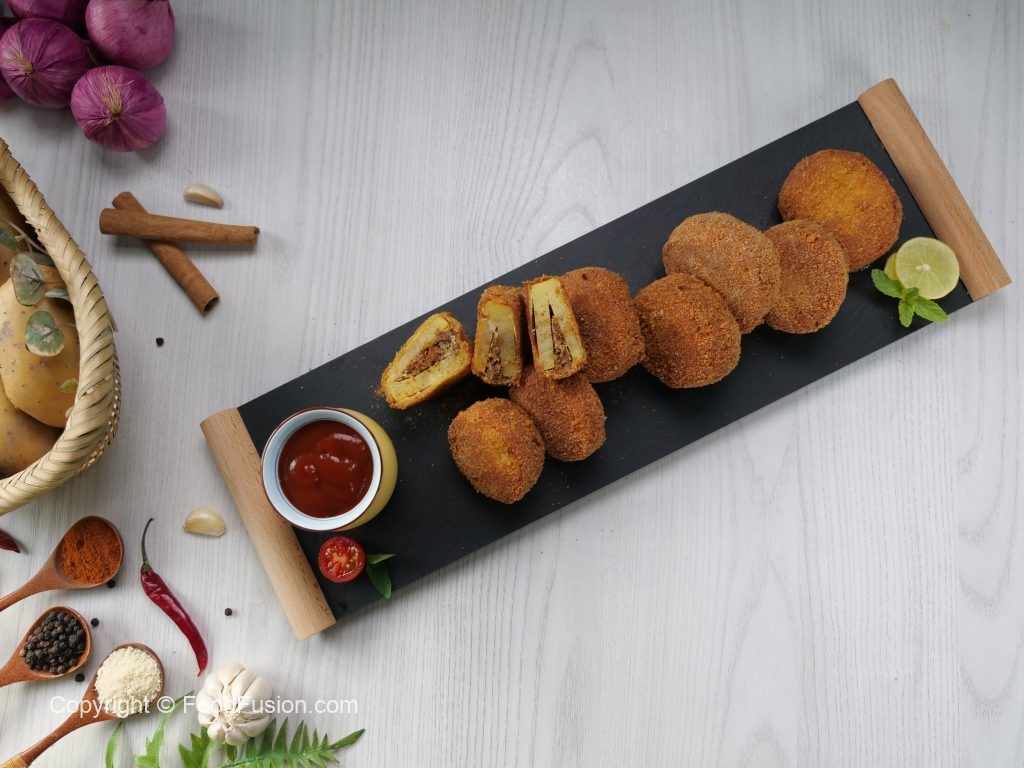 -Peel potatoes & cut ½ inch thick slices then cut half-moon (it will make it open up like a book) & stuff with mince filling & set aside.