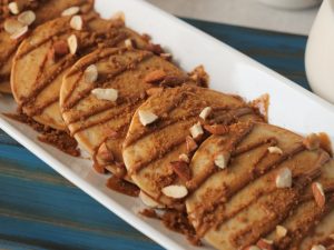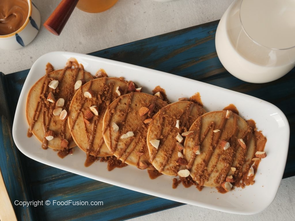 On serving plate,place lotus pancakes,drizzle lotus spread,sprinkle crushed caramel biscuit,almonds & serve!