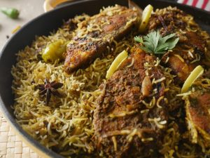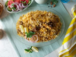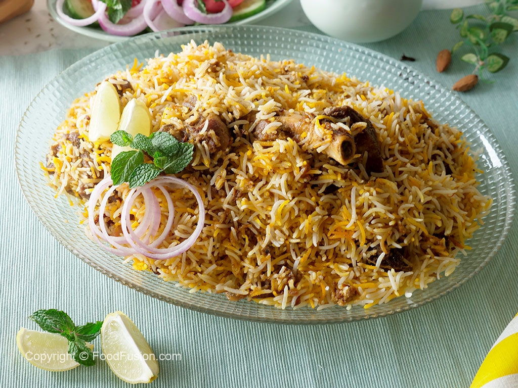 Add reserved mutton,fried onion,remaining spice mix,boiled rice and prepared saffron milk,cover and simmer on low flame for 8-10 minutes & serve!