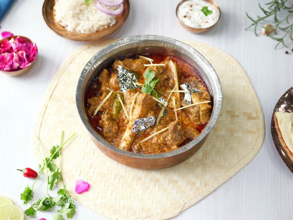 -On a muslin cloth,add black cardamom,cinnamon sticks,cloves,mace,nutmeg,cumin seeds,dried rose petals & tie to make a potli (bouquet garni) & add it in pot.