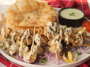 -Drizzle creamy garlic sauce over malai tikka bites,sprinkle fresh coriander & serve with puri paratha, green chutney & onion rings.
