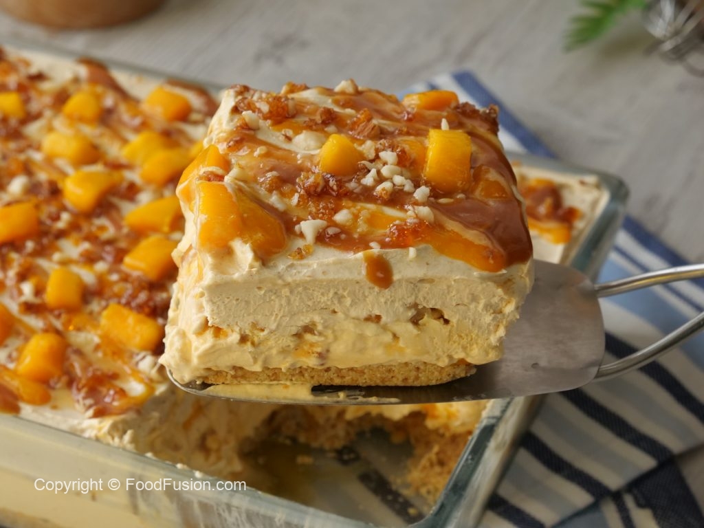 -Drizzle prepared butterscotch sauce,prepared almond crunch,mango chunks,prepared butterscotch whipped cream & spread evenly.