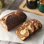 Grease 4 x 11“ loaf pan with cooking oil,lined with butter paper,add both reserved white batter & cocoa batter alternatively with the help of a ladle and tab few times.
