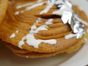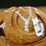 Cutter ki madad sa puri dough ko strips (about 1 inch) ki shakal mein cut ker lein aur swiss roll ki tarhan roll karein,dosri strip k upper roll rakh k phr sa swiss roll ki tarhan roll karein aur end ko stick ker dein,dry wheat flour mein coat ker lein.
