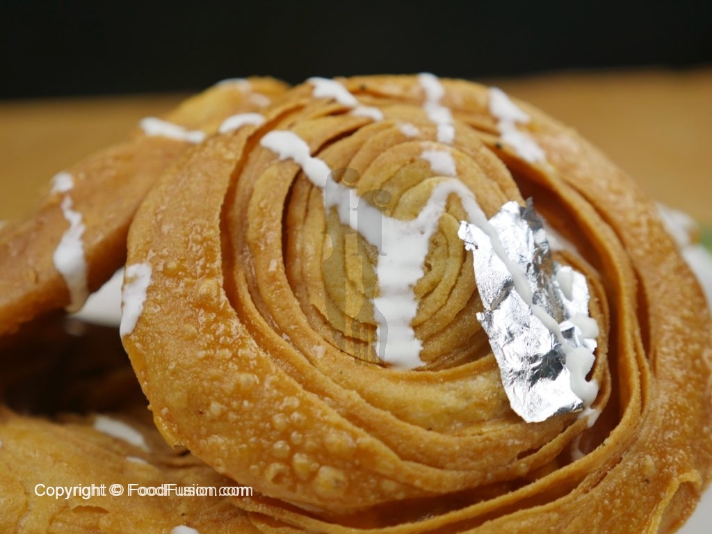 Karhai mein desi ghee garam karein aur round dough ko golden brown color hunay tak fry ker lein.