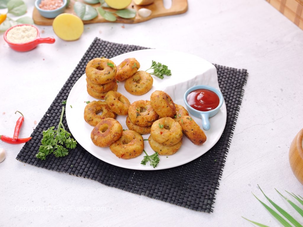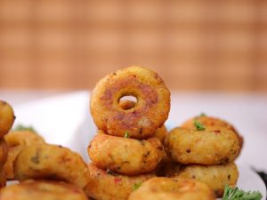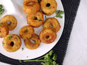 -With greased hands,take a small quantity of mixture (30g),make a ball & press a finger in the center to make a hole to create a donut like shape (makes 35).