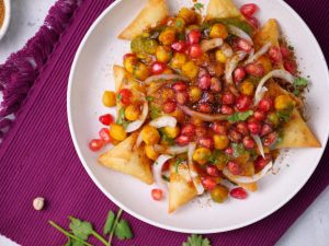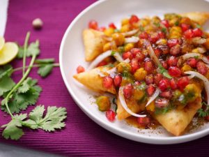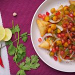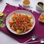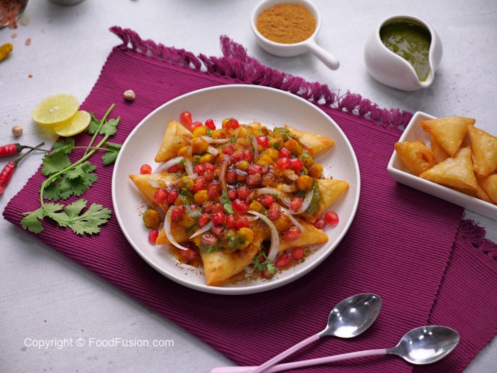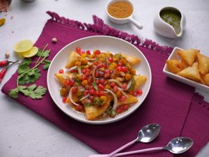-In a serving plate,add mini aloo samosa,cooked chickpeas,lemon juice,gur imli ki chutney,green chutney,onion,pomegranate,chaat masala,fresh coriander & serve!