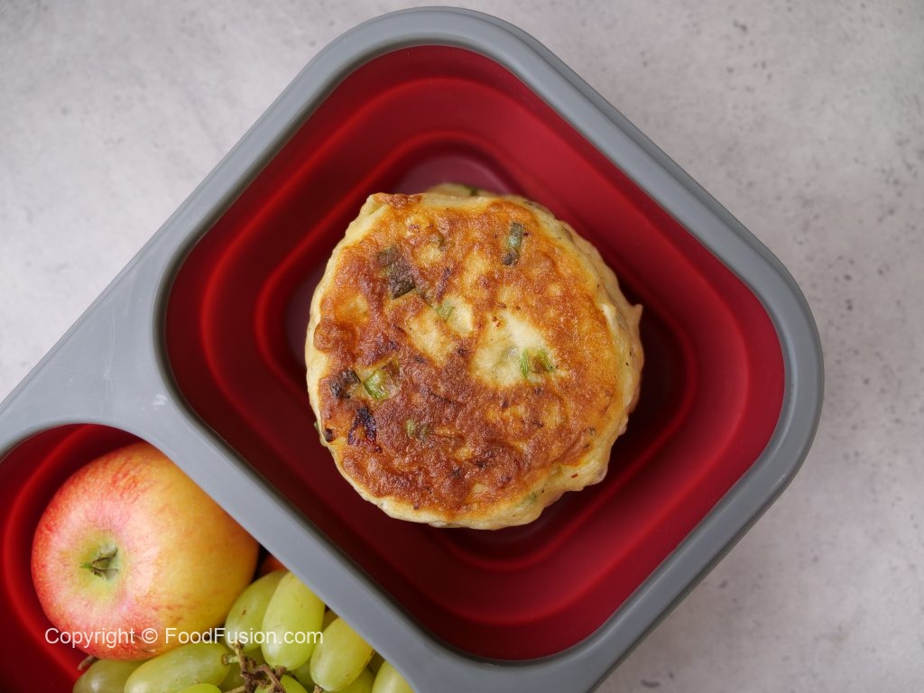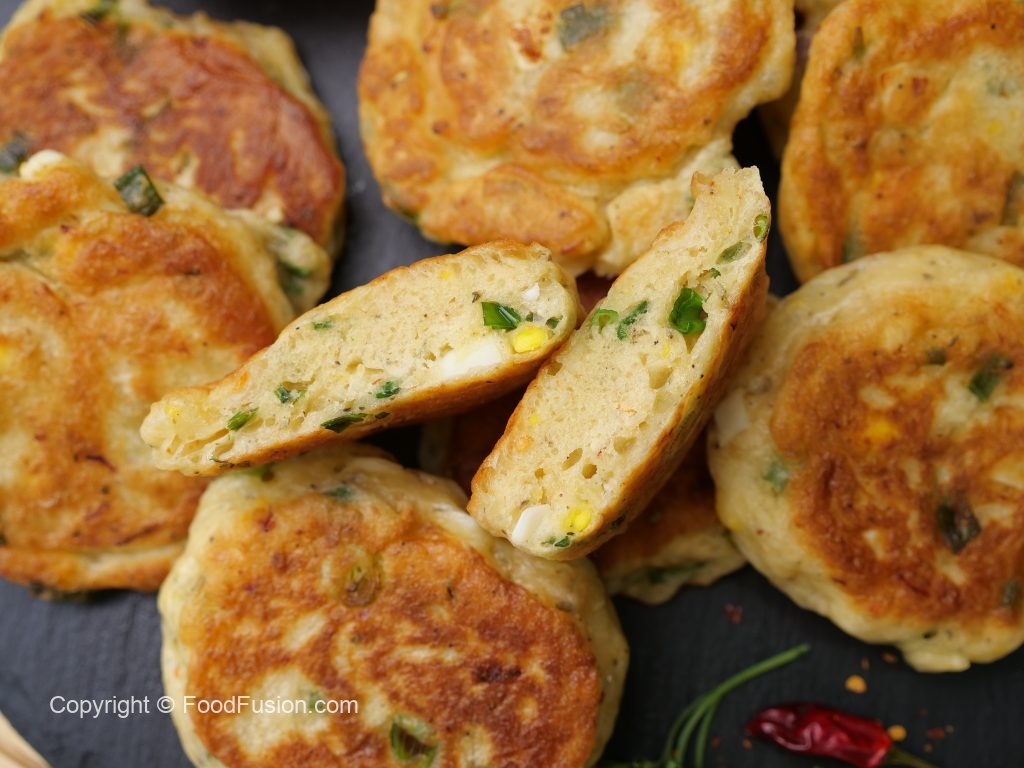 -In a frying pan,heat cooking oil,pipe out prepared mixture & flatten with the help of greased spoon & fry pancakes from both sides on low flame until golden brown.
