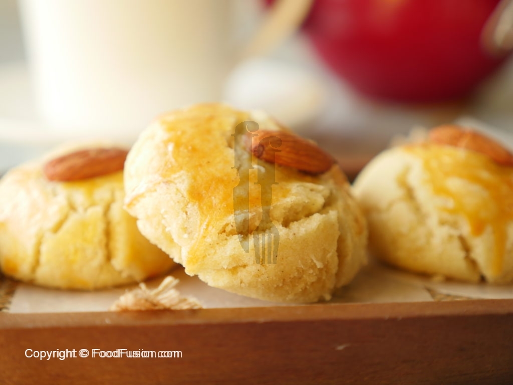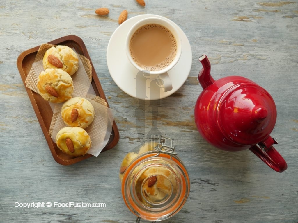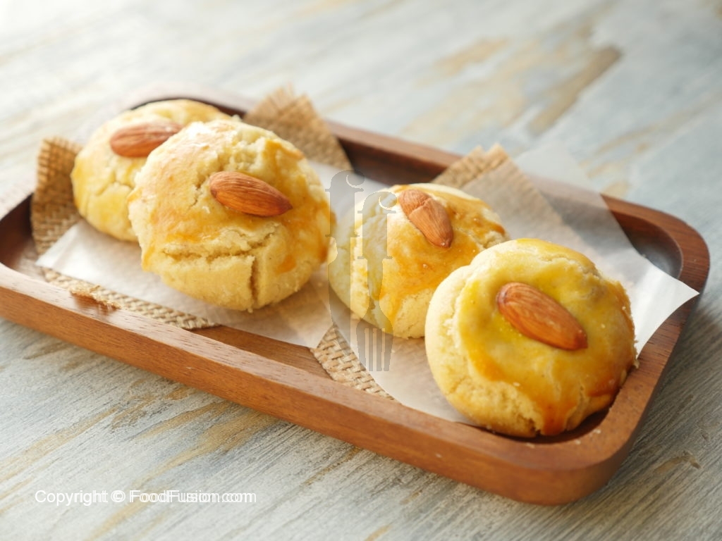 Baking plate/tray per butter paper laga lein aur nan khatai balls rakh dein,ande ki zardi aur roasted badam laga lein.