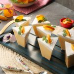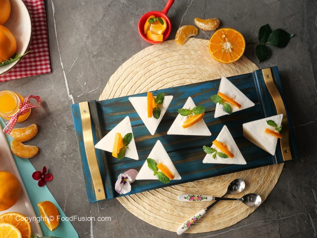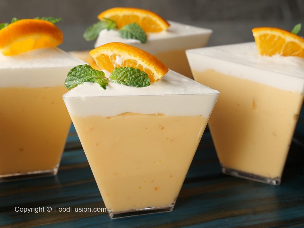 In serving cups,add a layer of orange mousse,whipped cream and scrape excess cream.