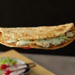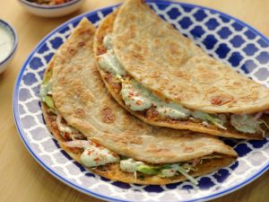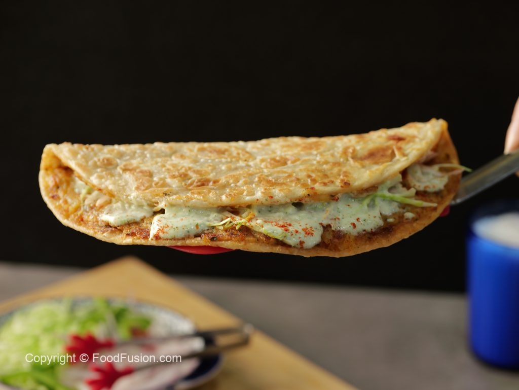 -Flip & on half side of paratha,add & spread cabbage,vinegar-soaked onion,capsicum,mint yogurt sauce,paprika powder,flip the other side of the paratha (makes 4-5) & serve!