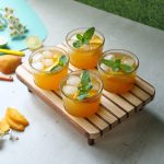 -Serving glass mein ice cubes,peach slices,tayyar peach drink aur podina dal kar serve karein!