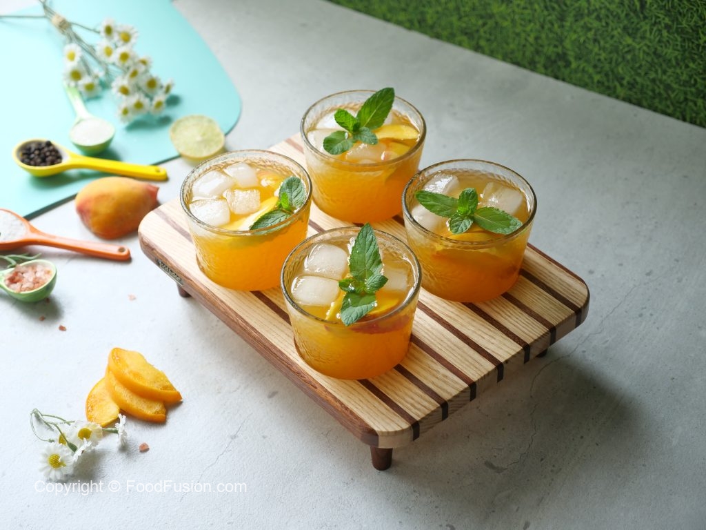 -In a serving glass,add ice cubes,peach slices,prepared peach drink,mint leaves & serve!