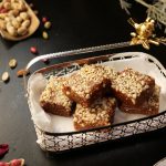 -On a greased mold,add peanuts,prepared barfi & spread evenly.