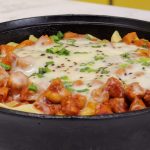 Cast iron pan mein penne pasta,cooked chicken,mozzarella cheese,hara pyaz aur black & white til ker dhak dein aur halki ancch per cheese melt ho janay tak paka lein (4-5 minutes).