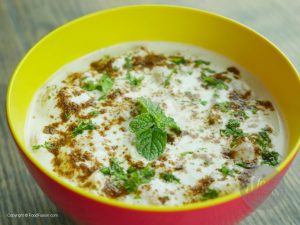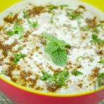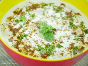 Ab bhalay pani main se nikal kar hath se press karke uska zaaid paani nikal len aur dahi nmain shamil karte jayen. Mix karlen aur chaat masala chirak dain.