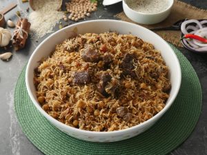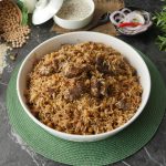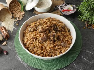 -Now add cooked meat,sprinkle reserved ground spices (1 tsp),cover with kitchen cloth & lid and cook on high flame for 2 minutes to build up steam then steam cook on low flame for 8-10 minutes.