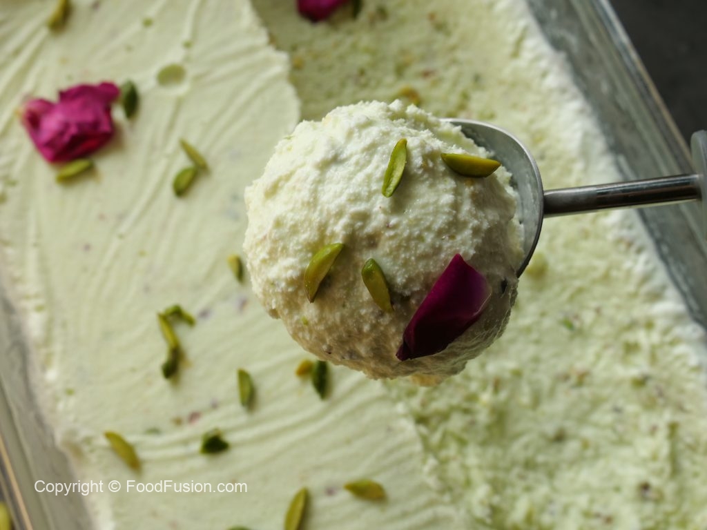 Once frozen completely,scoop out,decorate with pistachios & serve!