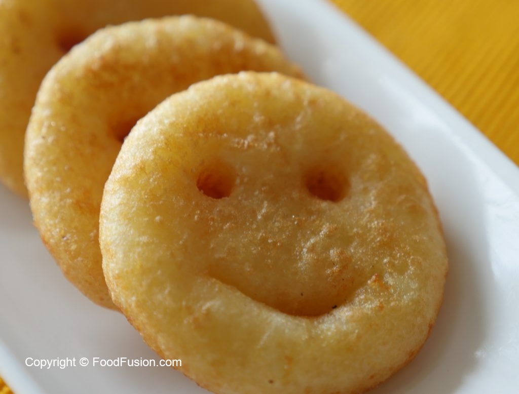 In wok,add corn oil,heat it and fry potato smileys on medium flame until golden brown.