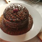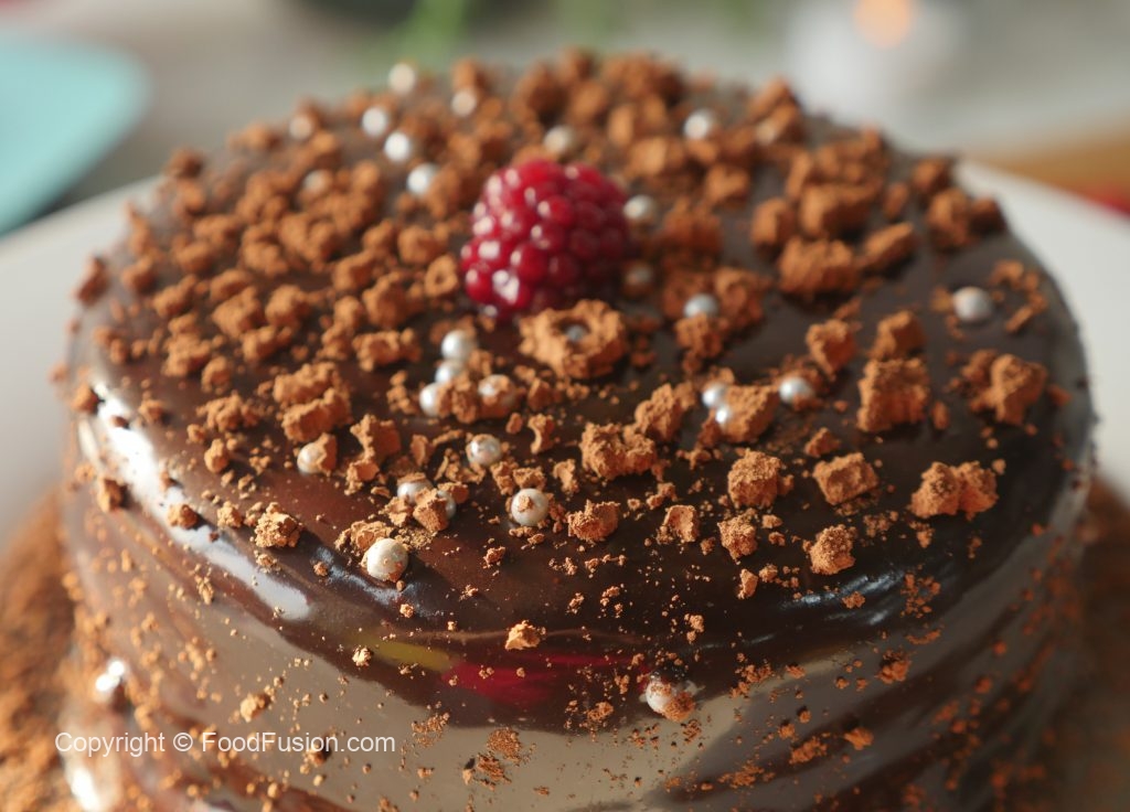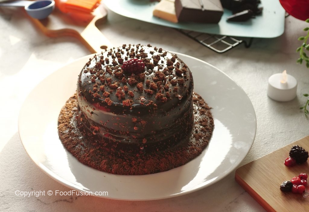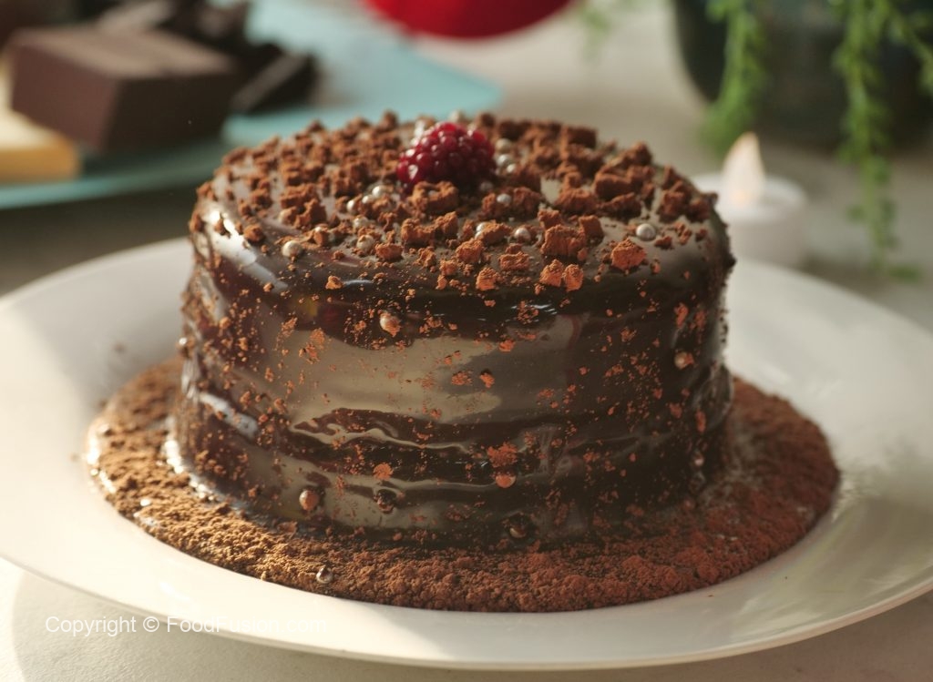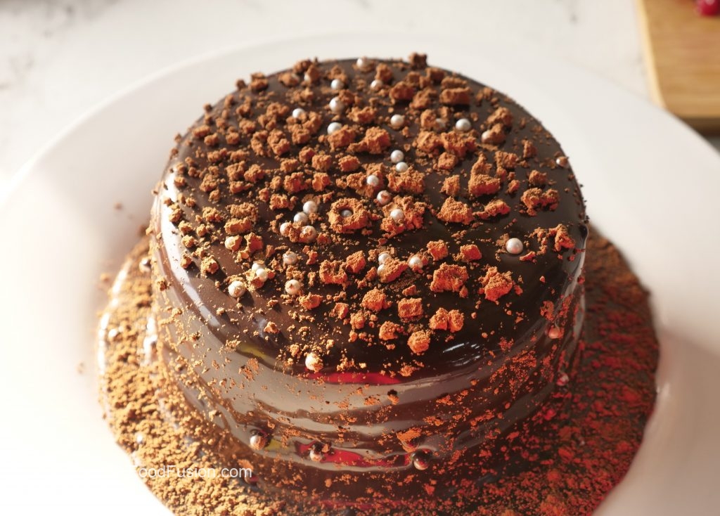 Now pour prepared chocolate glaze on the cake, sprinkle cocoa powder & sprinkles of your choice.