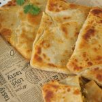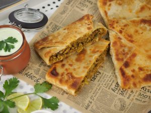 -On rolled dough,add prepared filling,fold one side & apply flour slurry then fold & apply flour slurry & make a square shape paratha.