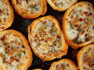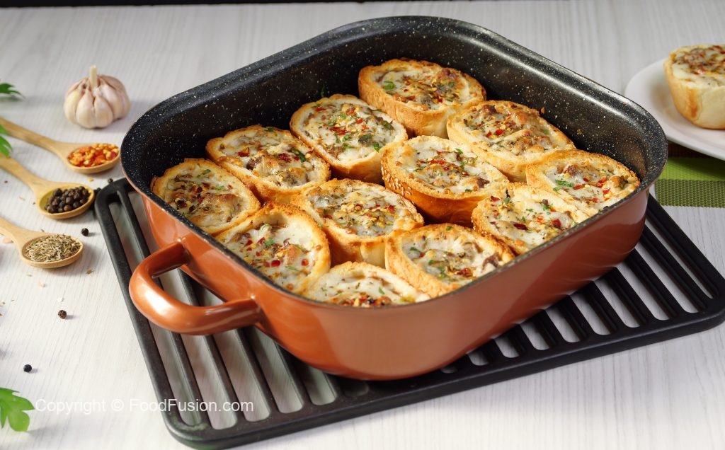 -Add cheese slice,beef filling,cheddar cheese,dried oregano & red chilli crushed (makes 12-14).