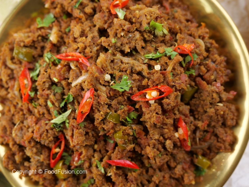 -In a wok,add beef mince,onion,tomatoes,ginger garlic paste,green chilli paste,yogurt,turmeric powder,salt,kashmiri red chilli powder,red chilli powder,garam masala powder,mix well & marinate for 15 minutes.
