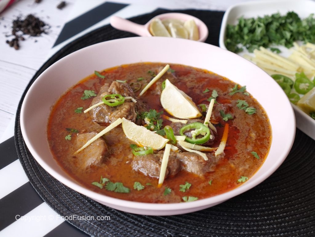Serving dish mein nihari,chilli oil (tarri),adrak,hari micrhein,hara dhania aur lemon dal ker serve karein!