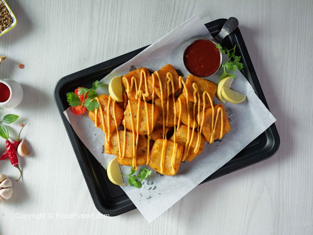 -Place rectangular mold on cling film,add & spread potato mixture & press gently then cut into square shape (30g) with the help of greased knife (makes 12).