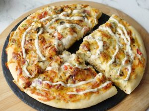 Ranch sauce 3-4 tbs dal ker pheela lein,cheddar cheese,mozzarella cheese,cooked chicken,shimla mirch,pyaz, tamatar,mushrooms,black olives,black olives,cheddar cheese,mozzarella cheese,dried oregano aur lal mirch crushed dal dein (makes 3 medium Pizzas).