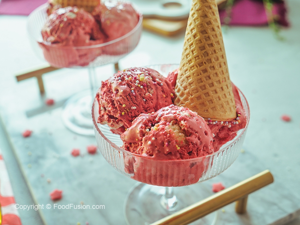 Make swirls gently with the help of skewer,cover the surface of ice cream with butter paper then cover with lid and freeze for 8 hours to overnight (yields: 2.5 litres).