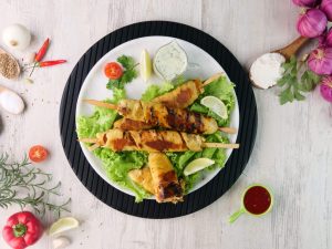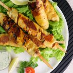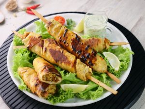 -Heat griddle & cook wrapped skewers on low flame from all sides until golden then fire roast on direct flame until its charred from all sides.