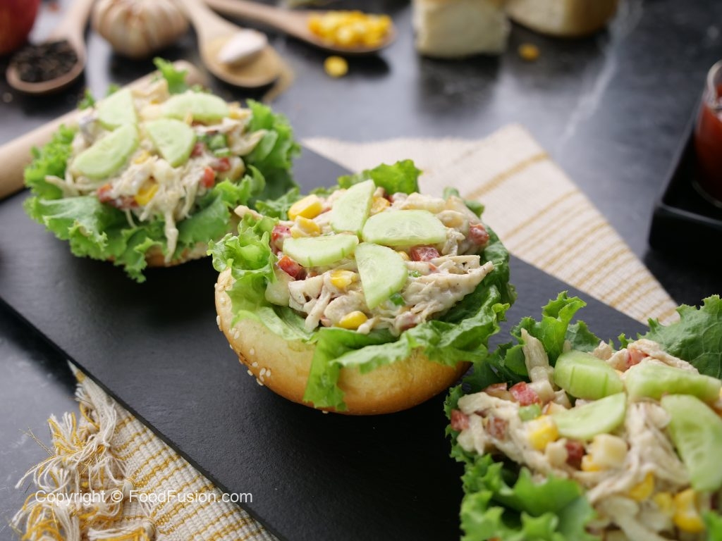 -Air fried/toasted burger bun mein salad patta rakh ker tayyar chicken salad dal dein aur kheera sa garnish ker ka serve karein! (Serves 6-8)