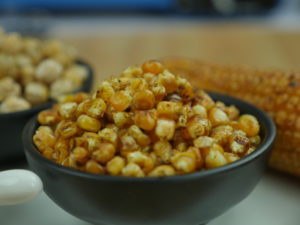 It is very important that the corn kernels are plucked by hand as shown in the video and the exterior of the corn kernels is completely dry. Any extra moisture on corn and chickpeas will make them too salty. Also make sure your salt is very hot when you put in the kernels.