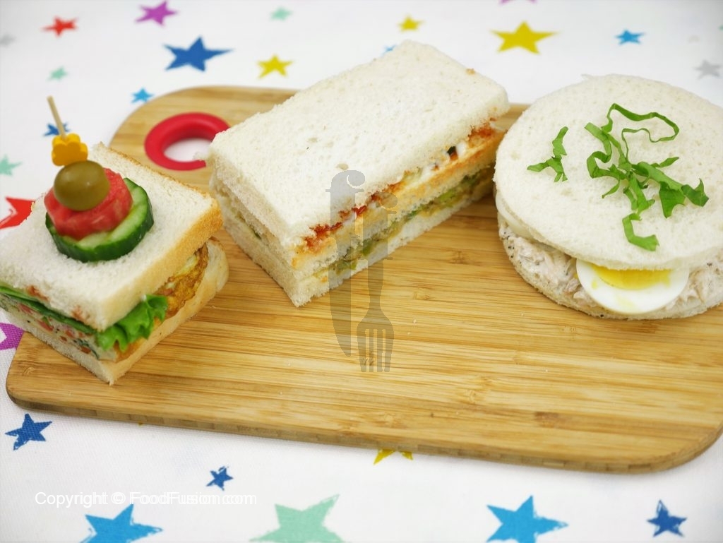 On bread slice,add & spread chicken mixture,boiled egg and top with bread slice & serve.