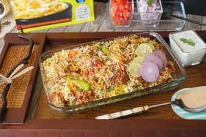 Spread dissolved red food color,green food color,orange food color & yellow food color,mint leaves, fresh coriander,fried onion,cover & steam cook on low flame for 18-20 minutes.