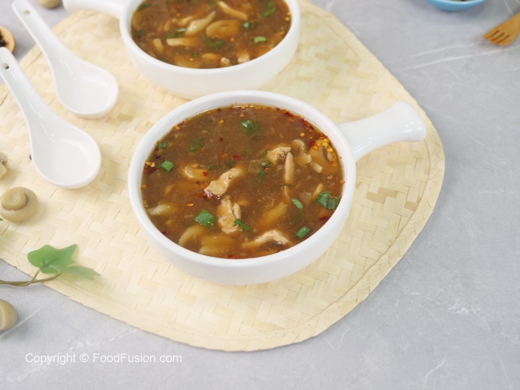 -Serving bowl mein lal mirch crushed,soy sauce,til ka tel,soup aur hara pyaz leaves dal ker serve karein!